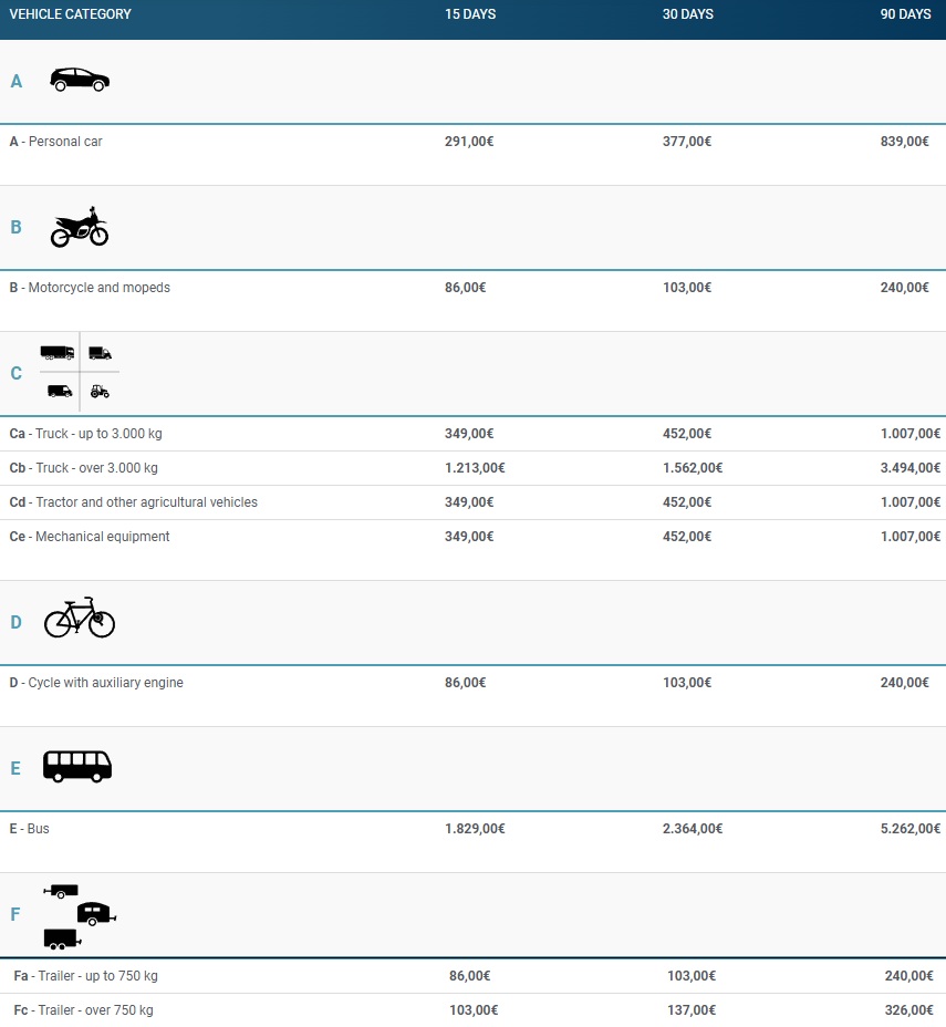 The frontier insurance tariffs shown in the table below are unique for the entire territory of the EEA countries and Switzerland.